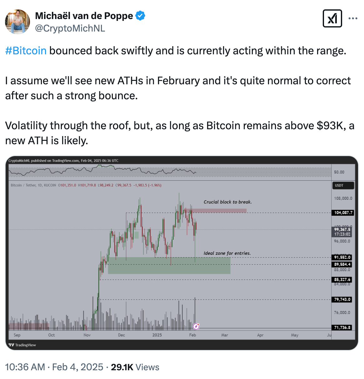 Meanwhile, MN Capital founder Michael van de Poppe said Bitcoin may see a new all-time high in February if the price holds above $93,000.