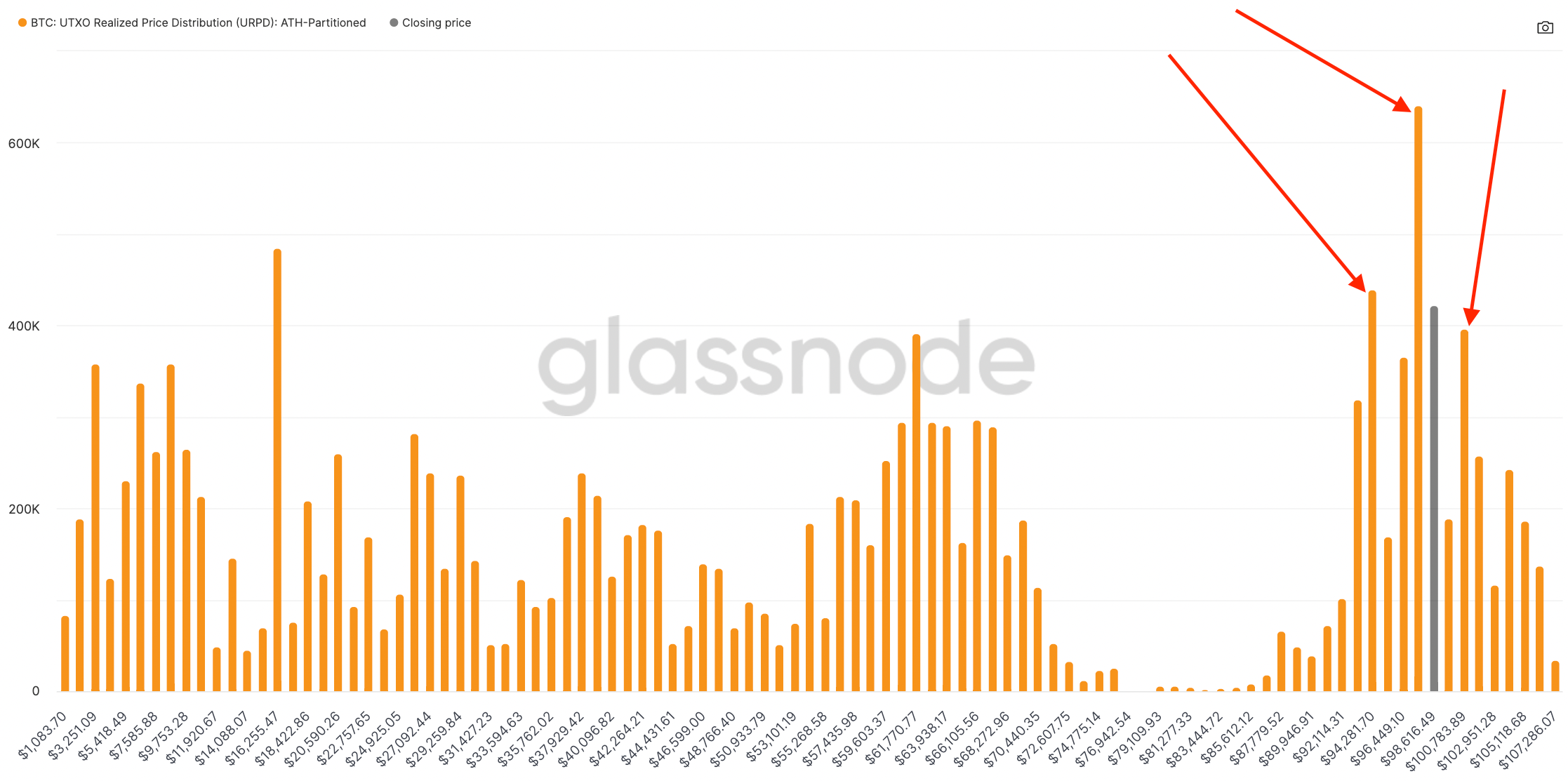 Some of the key Bitcoin support levels to watch are $97,500, $96,450, and $94,300, according to the Glassnode chart below.