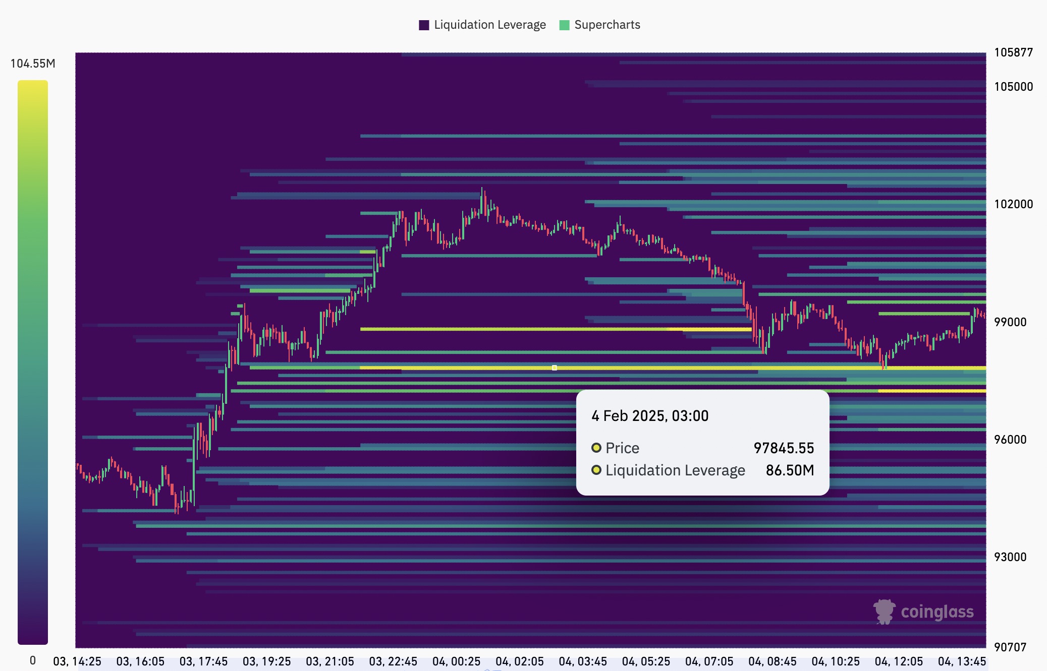 Bitcoin's immediate support just above $97,000 is especially important, according to the Bitcoin liquidation heatmap from CoinGlass.