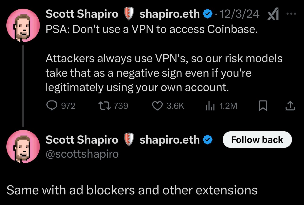 While Coinbase advises users against using a virtual private network (VPN) to avoid getting wrongly flagged by its internal security system, the investigators said that scammers explicitly block VPNs from phishing sites, adding, “This shows Coinbase’s failure to diagnose the actual problem.”