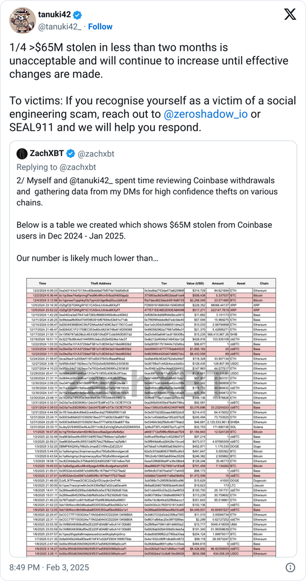 On Feb. 3, independent crypto investigator ZachXBT and tanuki42 from zeroShadow reported that Coinbase users lost more than $65 million in December 2024 and January 2025 alone. Still, the duo claimed the losses were even higher, as their calculations do not consider inaccessible police complaints.