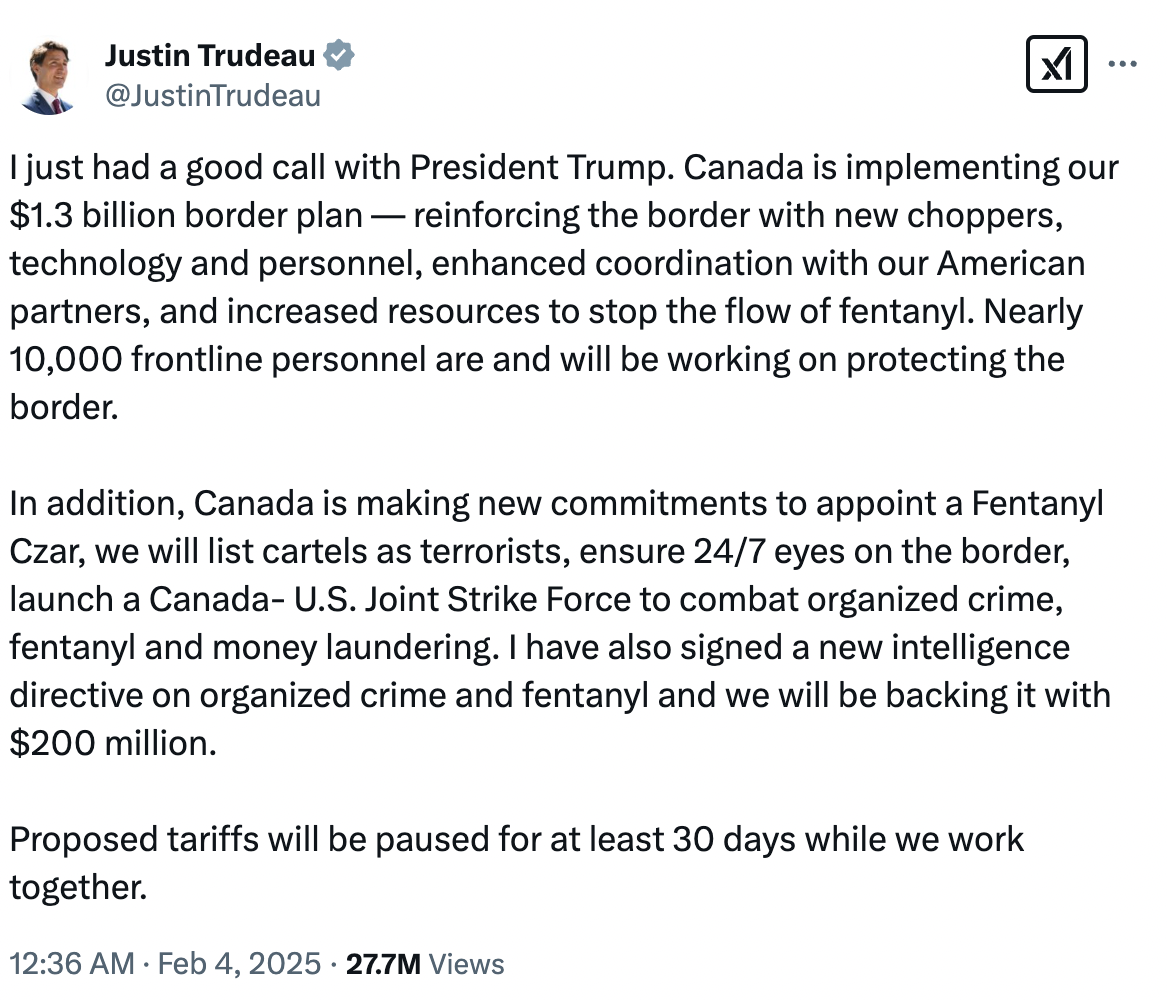 “Canada is implementing our $1.3 billion border plan” and will ensure “enhanced coordination with our American partners” to protect the border, Trudeau said in a Feb. 3 post on X.