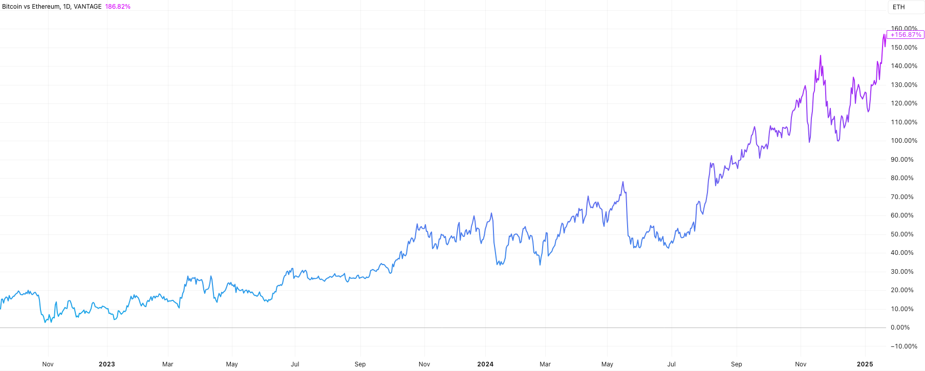 However, more than two years later, Ethereum’s performance tells a different story, as Bitcoin has gained around 160% against Ether since the Merge.