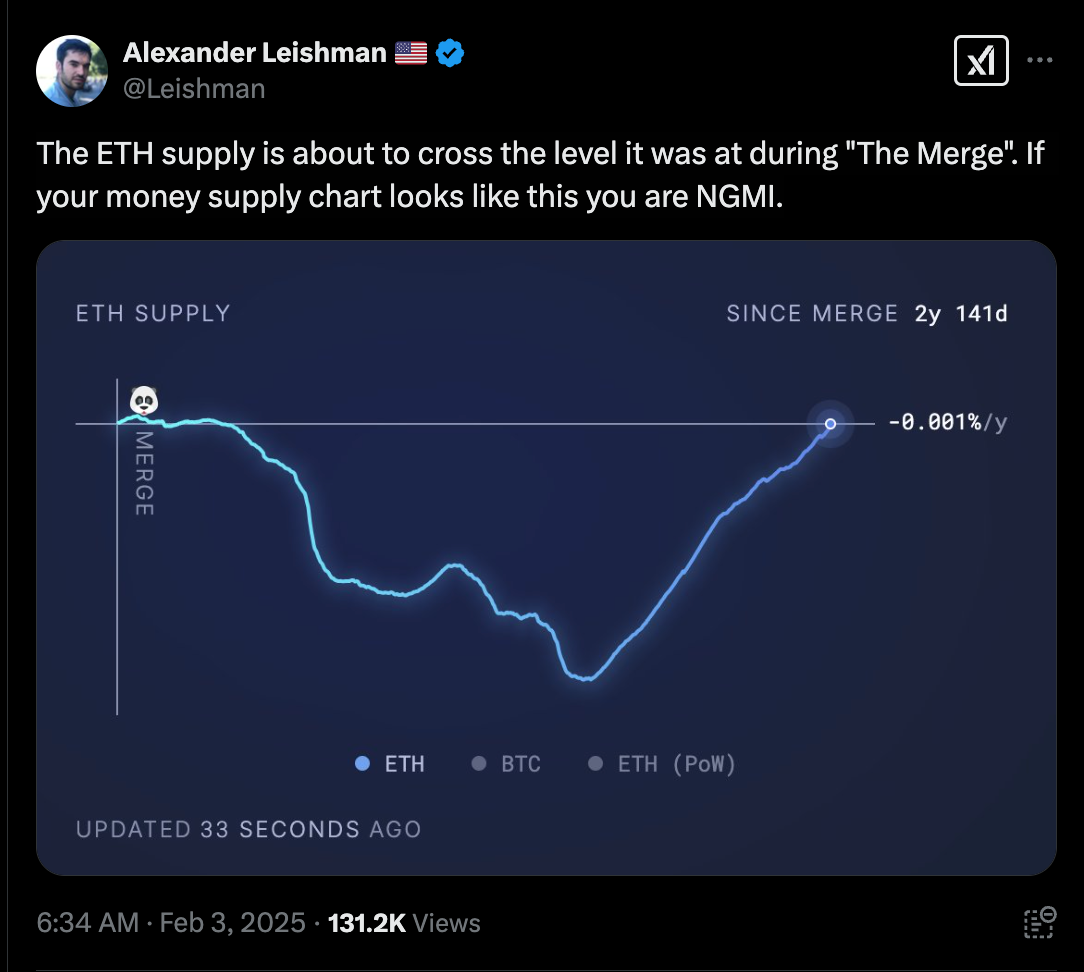 The downward trend persisted throughout mid-2024, reflecting a steady decrease in network demand. While fees stabilized in late 2024 and early 2025, they now remain well below previous highs, resulting in a rising Ether supply.