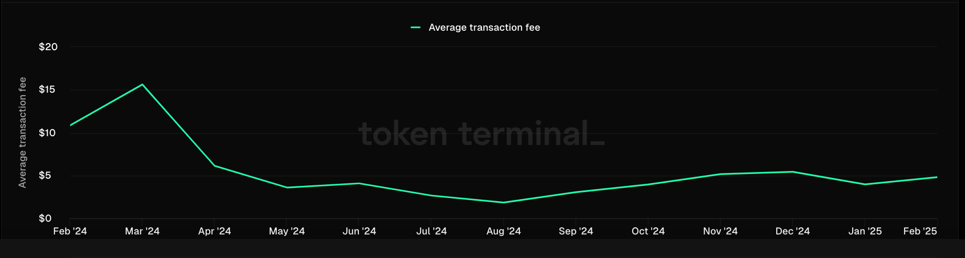 Data from Token Terminal illustrates this trend. Ethereum’s average transaction fee peaked above $15 in March 2024 but saw a sharp decline by April, dropping below $5.