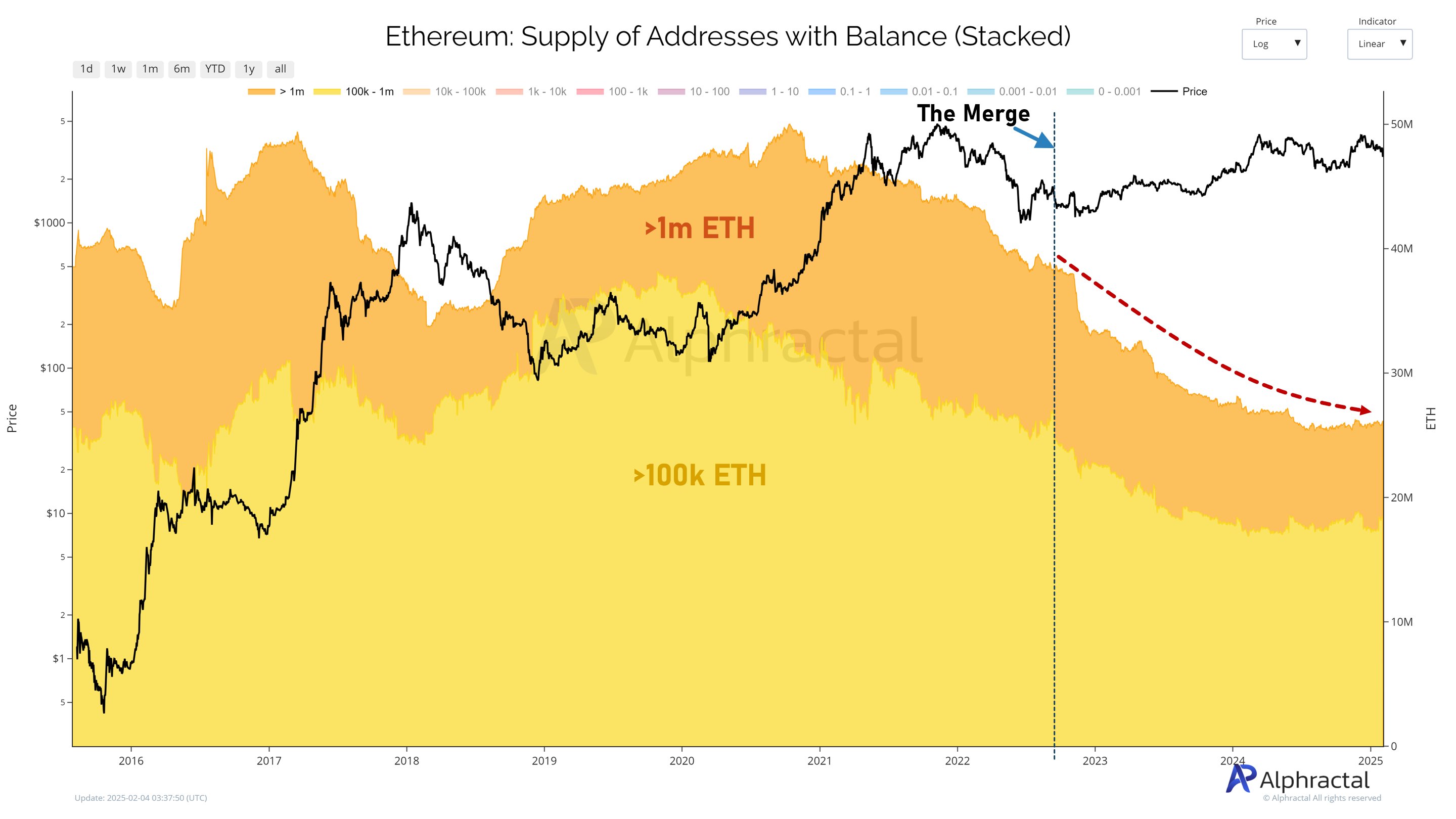Alphractal’s data shows that wallets holding 100,000 ETH or more have massively decreased their holdings, while addresses with 1 million ETH have also decreased.
