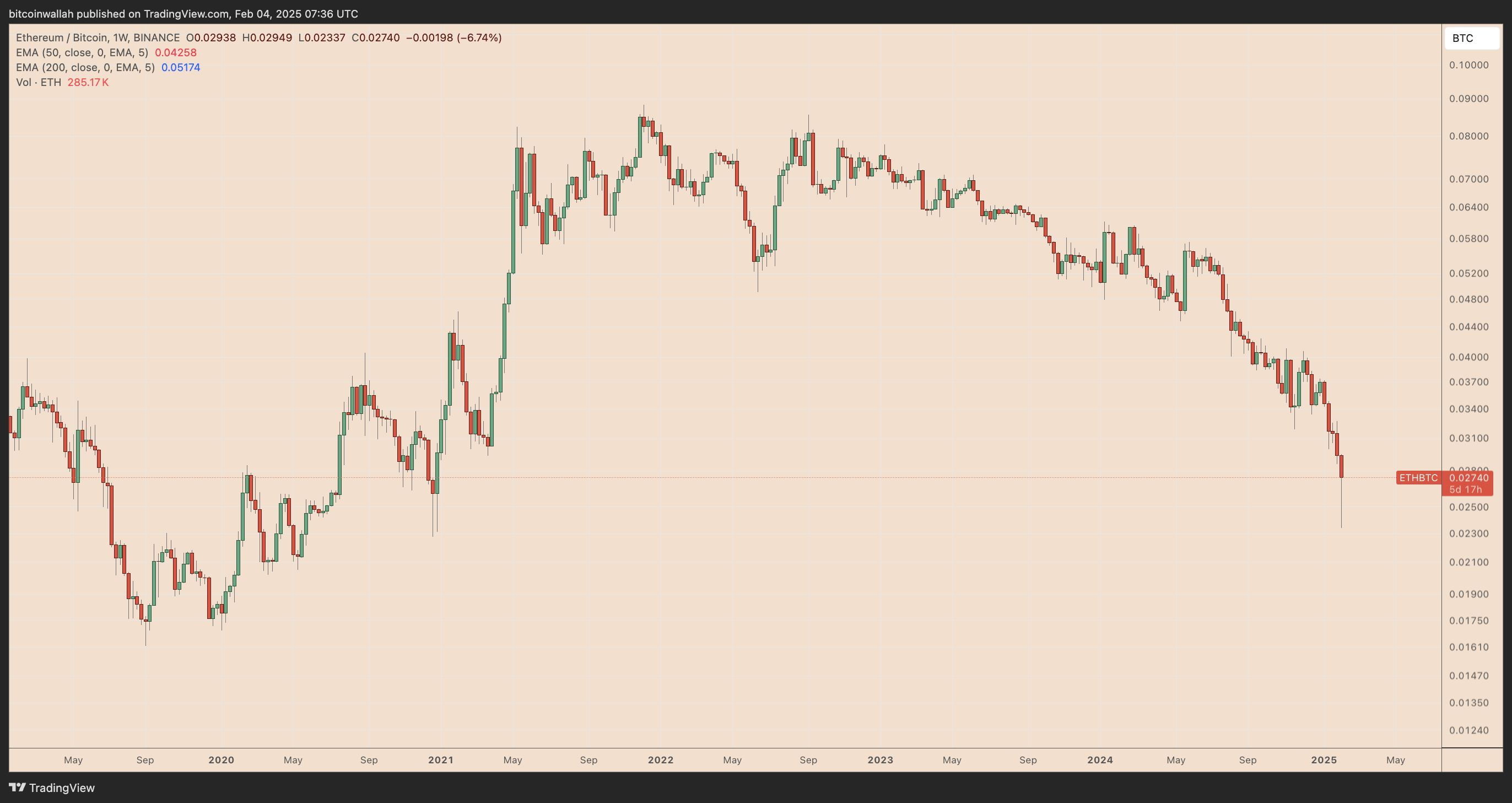 Ethereum’s weekly chart shows ETH/BTC in oversold territory, according to the Relative Strength Index (RSI). Simultaneously, the pair is trading near a historical support area defined by the 0.024-0.023 BTC range.